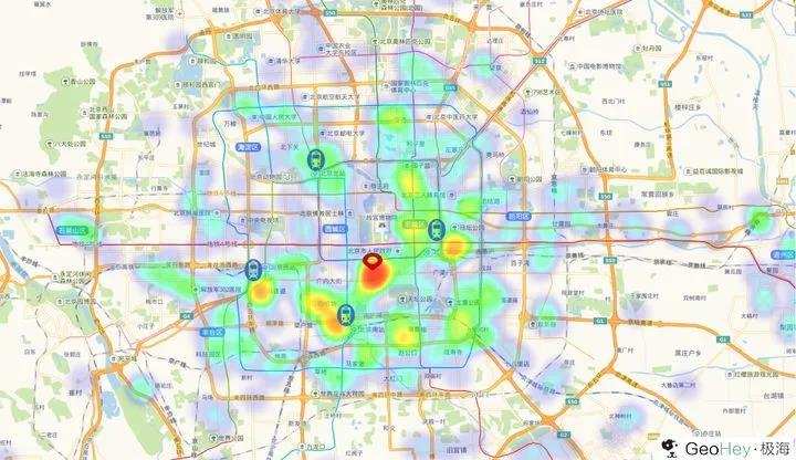 上图中,有比较明显的4个红色色块,从左至右,有火车标识的区域,分别是北京西站、北京南站、北京站,靠北的是北京北站,红色标识的则为天安门、长安街商圈。
