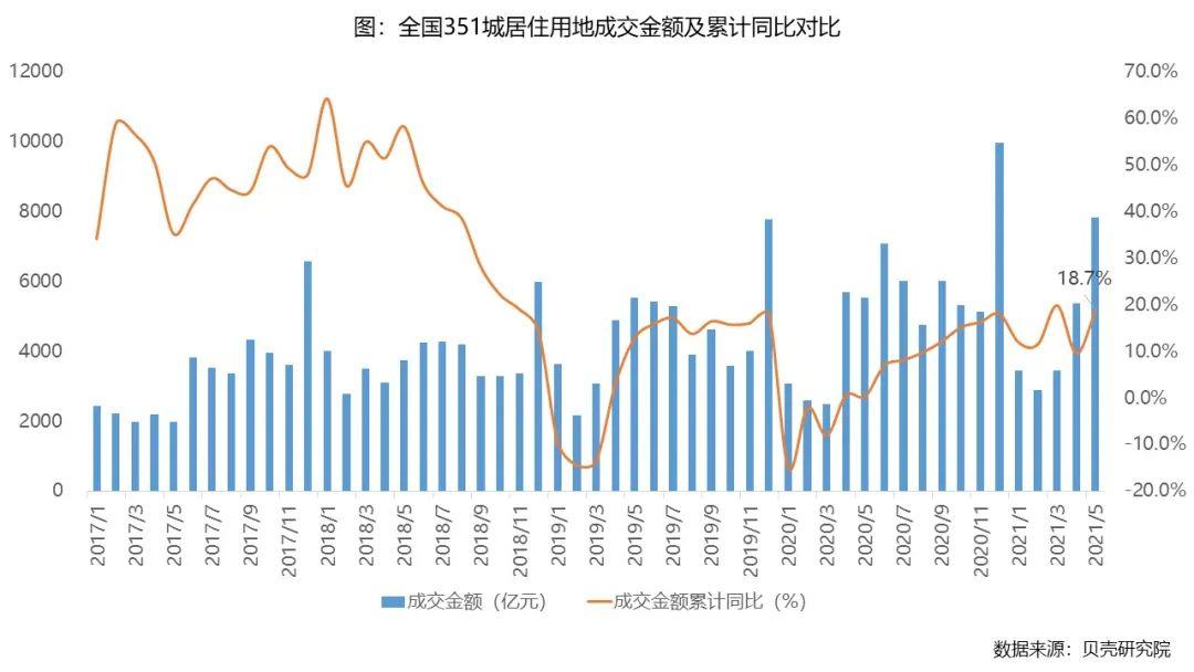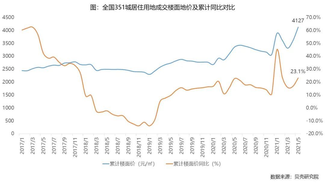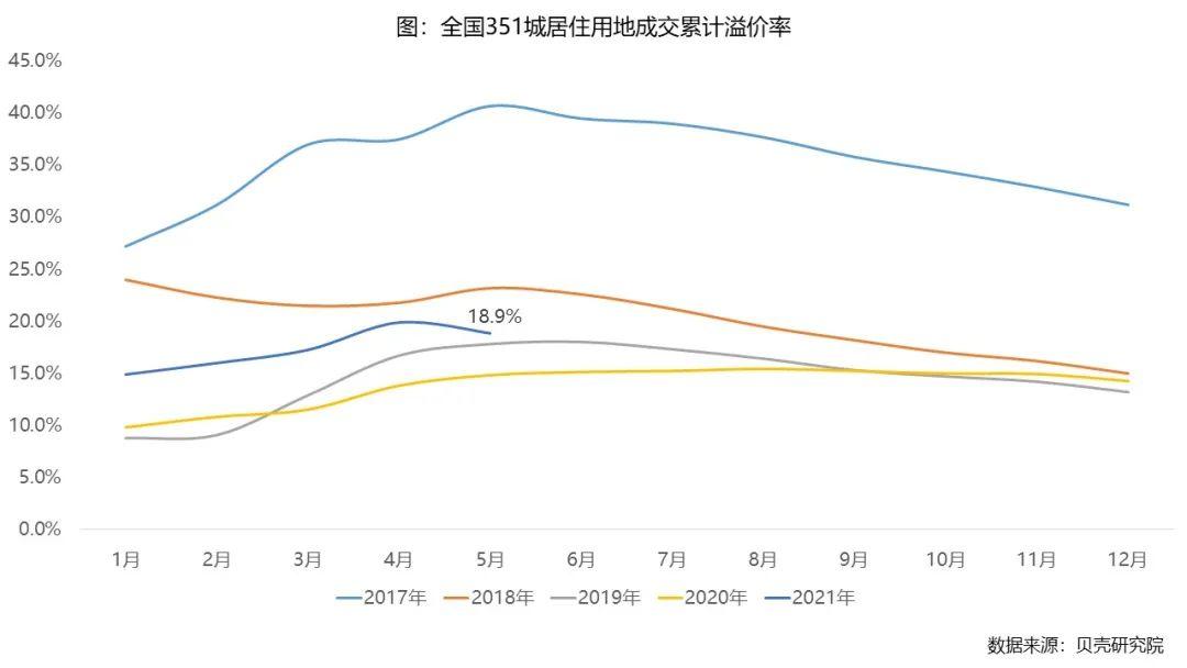 5月全国351城住宅用地成交规划建筑面积13613万平方米、成交金额7836亿元。1-5月全国351城住宅用地成交规划建筑面积55802万平方米、累计同比下滑3.6%,成交金额23031亿元、累计同比增速回升至18.7%。全国351城住宅用地成交楼面地价累计同比增长23.1%,主要原因是杭州、苏州、南京、广州、北京等城市的土地集中供应导致高能级城市成交占比明显提升,从而带动全国楼面地价结构性增长。全国351城住宅用地成交溢价率18.9%,同比增长4.1个百分点,其中20座集中供地城市成交溢价率较2020年成交溢价率增长2.8个百分点。