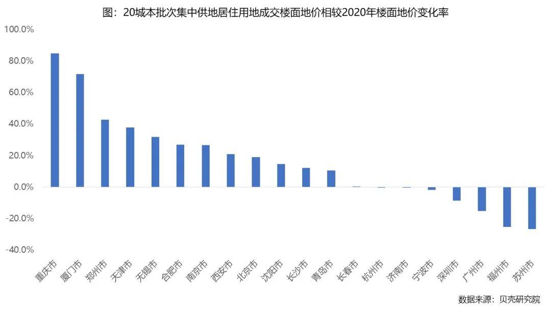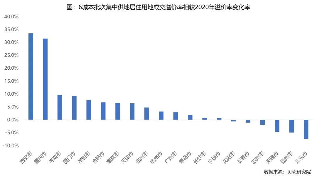 各城市本批次集中供地成交居住用地规划建筑面积相当于2020年全年成交量的三成水平,省会城市成交楼面地价受结构影响有所提升。本次集中供地中20座城市(包含西安)住宅用地总成交金额为8708亿元,相当于2020年全年集中供地城市总和的36.5%,规划建筑面积9220万平方米,相当于2020年全年集中供地城市总和的33.4%。重庆因优质地块集中出让,厦门因稀缺地块的出让,带动成交楼面地价提升,另外,其他省会城市成交楼面地价涨幅明显。以西安、重庆为代表的不限地价城市溢价率提升明显,省会城市溢价率增长相对明细,而北京、苏州、无锡、福州等严控溢价率的城市溢价率下滑。济南、青岛虽然溢价率长期稳定在10%以下,但由于部分地块的规则变化,以及优质地块的集中,从而拉动溢价率回升。