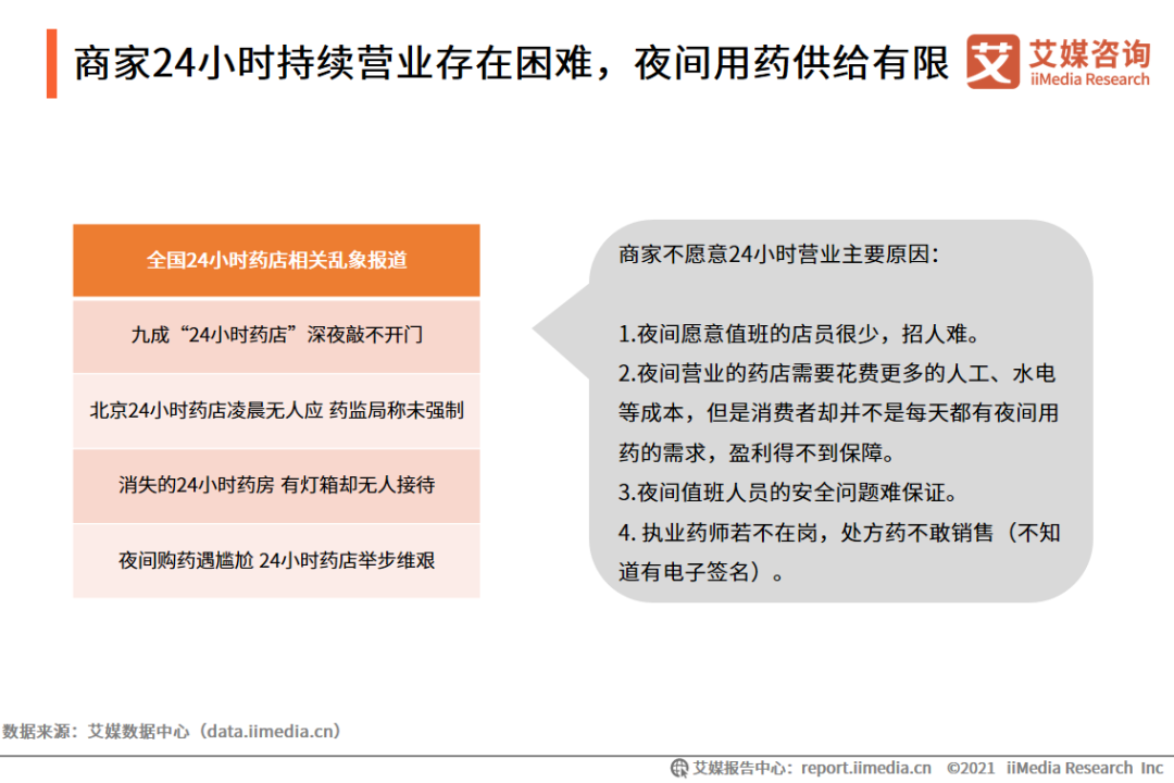 艾媒咨询进行商家访谈发现,当前商家做到24小时营业存在很多困难,一是晚上营业招人难,二是夜间营业成本高,三是夜间营业人员的安全问题难以保证,四是存在夜间处方药的难题。