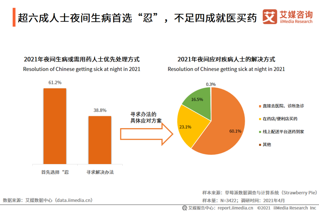 但值得注意的是,夜间买药服务需求强烈,但买不到药、不知道哪里能买药的现象普遍存在。行业报告数据显示,夜间生病时六成以上用户首选“忍”。而在夜间患病的人群未买药解决的主要原因里面,三个原因都指向了夜间买药难、买药不方便的现象,比例接近65%。