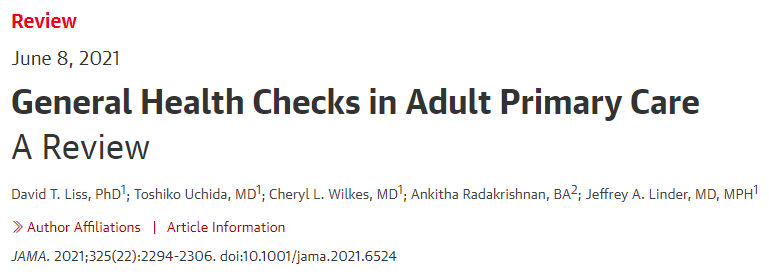 [1] Liss DT, Uchida T, Wilkes CL, Radakrishnan A, Linder JA. (2021). General Health Checks in Adult Primary Care: A Review. JAMA, doi:10.1001/jama.2021.6524