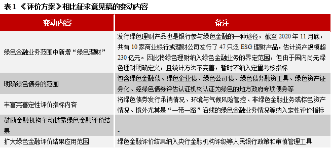 6月9日,人民银行发布《银行业金融机构绿色金融评价方案》,是在2020年7月21日《关于印发〈银行业存款类金融机构绿色金融业绩评价方案〉的通知(征求意见稿)》(以下简称“征求意见稿”)的基础上发布的正式版本。《评价方案》将于2021年7月1日起施行。评价指标和方法上采用定量(权重80%)和定性(权重20%)结合的方法,其中定量指标有4个,定性评价指标有3个。与征求意见稿相比,正式版《评价方案》的变动如下表所示。