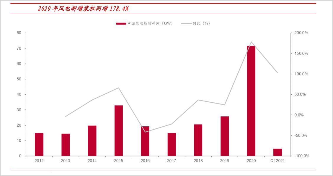 国家能源局数据显示,2020年,国内风电新增并网容量7167万千瓦,同比飙升178.4%,其中去年四季度创下了新增装机5625万千瓦的历史记录,而2017-2019年三年合计新增装机量也才不过6136万千瓦。