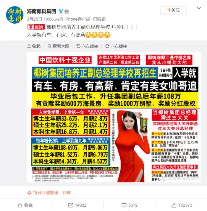 2021年3月25日,椰树集团官方微博发布招生内容显示,“椰树集团培养正副总经理学校再招生,入学就有车、有房、有高薪,肯定有美女帅哥追”。据该广告,本次招生,专业不限,毕业后包工作,升任集团副总后年薪108万,有贡献奖励600万海景房、奖励1000万别墅、奖励分红股权。