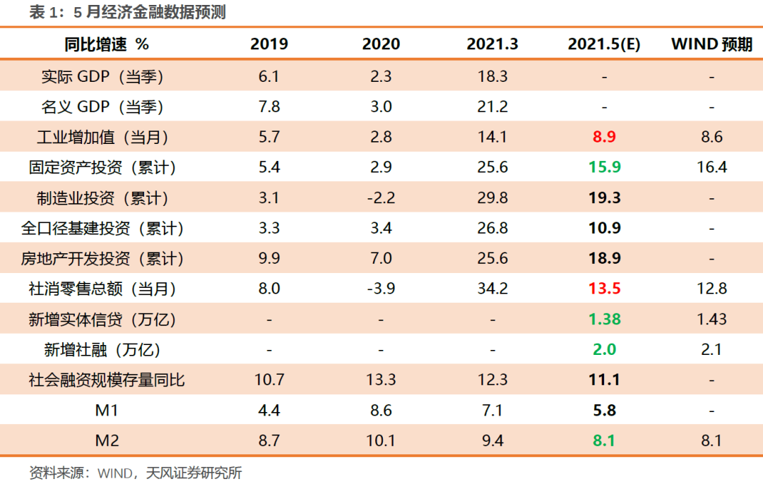 1. 制造业复苏力度温和。4月当月制造业投资复合增速3.5%,剔除基数效应后较3月小幅回升,绝对增速仍然不高。制造业投资复苏弱于预期,一定程度上与企业家信心不足(对需求尤其是出口外需的持续性信心不足)、原材料价格上涨和债务负担加重有关。当前上述掣肘因素没有明显改善,5月数据显示出口景气度有边际回落迹象,本轮盈利改善和产能利用率回升向制造业投资的传导弹性可能偏低,后续仍是温和复苏为主。预计1-5月制造业投资累计同比增速19.3%(前值23.8%),其中5月当月同比增速10.0%(前值14.8%),复合增速为2.1%(前值3.5%),小幅回落主要是受基数影响。