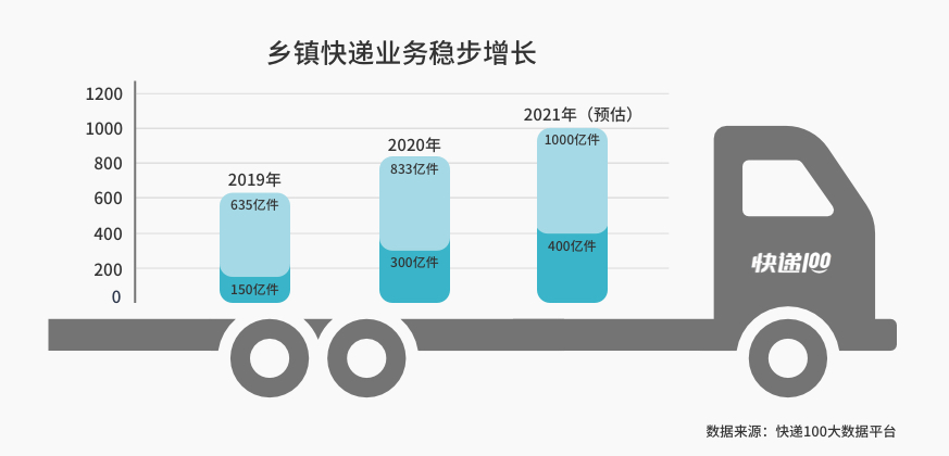 日前,国家邮政局宣布,截至6月1日,今年我国快递业务量已突破400亿件。按照中国领先的快递物流信息服务商快递100的大数据预估,2021年全年快递总量将突破1000亿件,再创新高。快递100数据显示,2020年乡镇快递业务量达300亿件,占全国总量的35.99%,而今年乡镇快递量预估将占总量的四成。