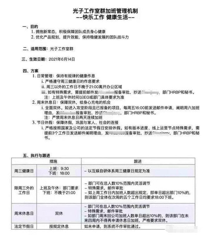具体来看,自6月14日起,光子工作室将严格遵守周三健康日,周三18:00下班,其他工作日不晚于21:00离开办公区域,如果有特殊需要要提起报备审批。此外,周末全面双休,节假日休假严格按照国家法定节假日安排休假。