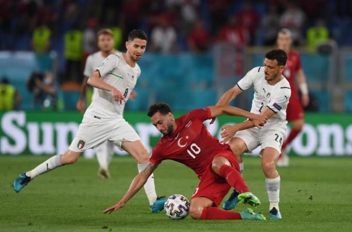 图为6月11日,在罗马奥林匹克体育场举行的欧洲足球锦标赛揭幕战中,土耳其队恰尔汉奥卢(右二)与意大利队弗洛伦齐(右一)拼抢。(图片来自欧锦赛官网)