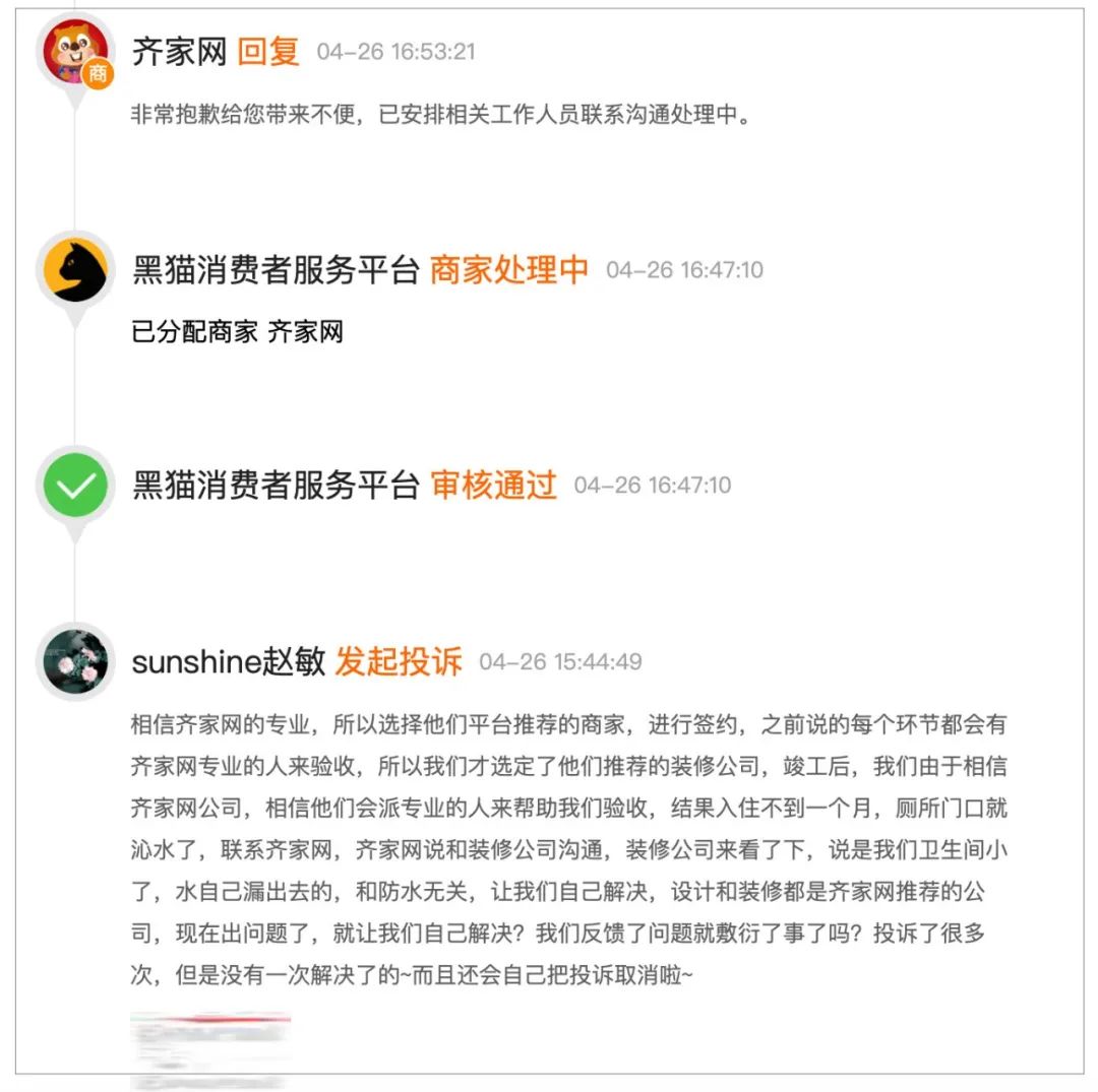据媒体报道,有用户反映称装修出现了诸多问题,比如油漆质量问题,墙面裂缝,柜子偷工减料,地板颜色装错等。该用户向齐家网反映问题,收到客服会联系装修公司的反馈后,再无下文。