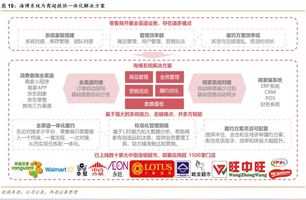 盘古系统侧重营销获客。招股书显示,截至2020年3月31日,盘古营销系统的客户关系管理工具已被覆盖24000多家店铺的181家零售商采用。截至2020年8月,海博系统已上线中百仓储、华冠、永旺、卜蜂莲花、农工商超市等约30家大中型连锁超市,部署应用超过1200家门店。