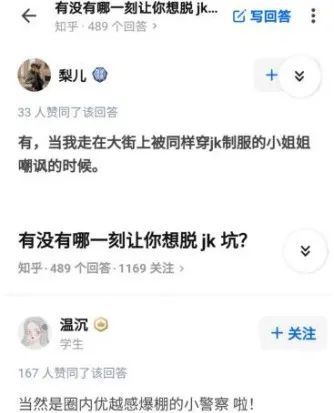 知乎上有这样一个问题,“有没有哪一刻让你想脱JK坑?”,截至目前,问题共收获247万关注,400多回答,其中不乏很多人表达了对JK警察和圈内风气的不满。