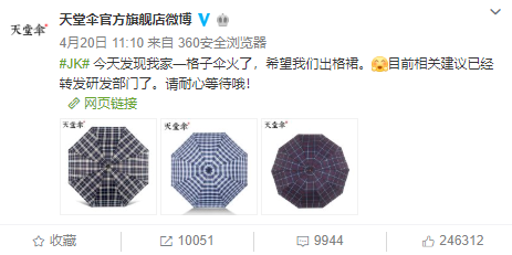 图:天堂伞官方回应微博(来源微博)