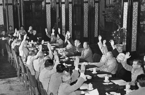 △1954年6月14日,中央人民政府委员会第三十次会议通过《中华人民共和国宪法草案》和关于公布宪法草案的决议。图为出席会议的全体委员举手通过《中华人民共和国宪法草案》。