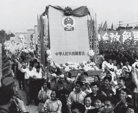 △1954年国庆节,游行群众抬着《中华人民共和国宪法》模型通过天安门