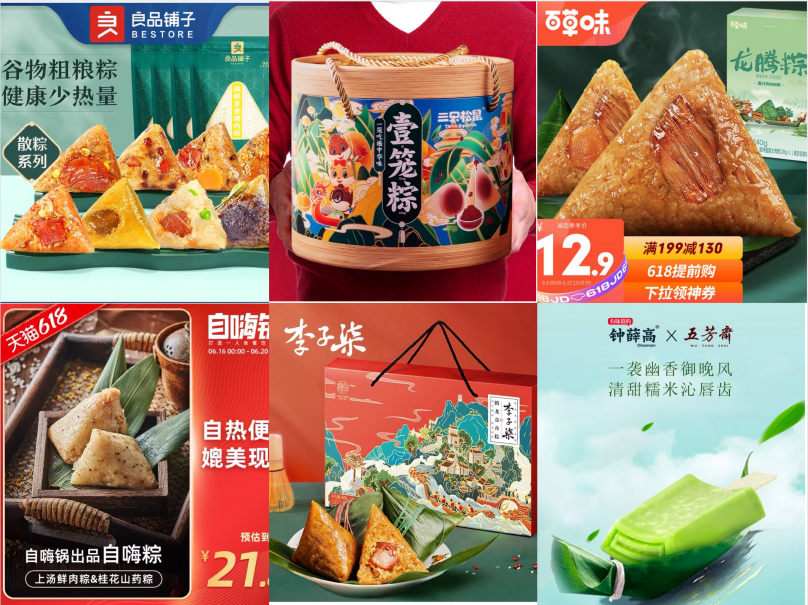 良品铺子的粗粮健康粽、三只松鼠的高汤鲜汁水粽、百草味的龙腾粽、自嗨锅的自嗨粽子、李子柒的龙舟飘香粽,哪怕是钟薛高这样的雪糕品牌,都联合五芳斋推出了“清煮箬叶粽香雪糕”,蹭了一波热度。