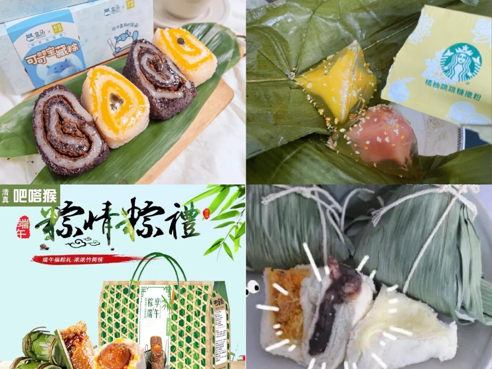 此外,部分商家们创新之路上,摒弃了箬叶、糯米等传统材料,如奈雪的茶出品用蛋皮、麻薯代替糯米的“奶茶粽”、星巴克用水晶预拌粉做的开袋即食“星冰粽”、吧嗒猴用竹筒包裹糯米和内馅儿做的“竹筒粽”,以及各种网红美食博主等用吐司代替箬叶做的“吐司粽”等等。