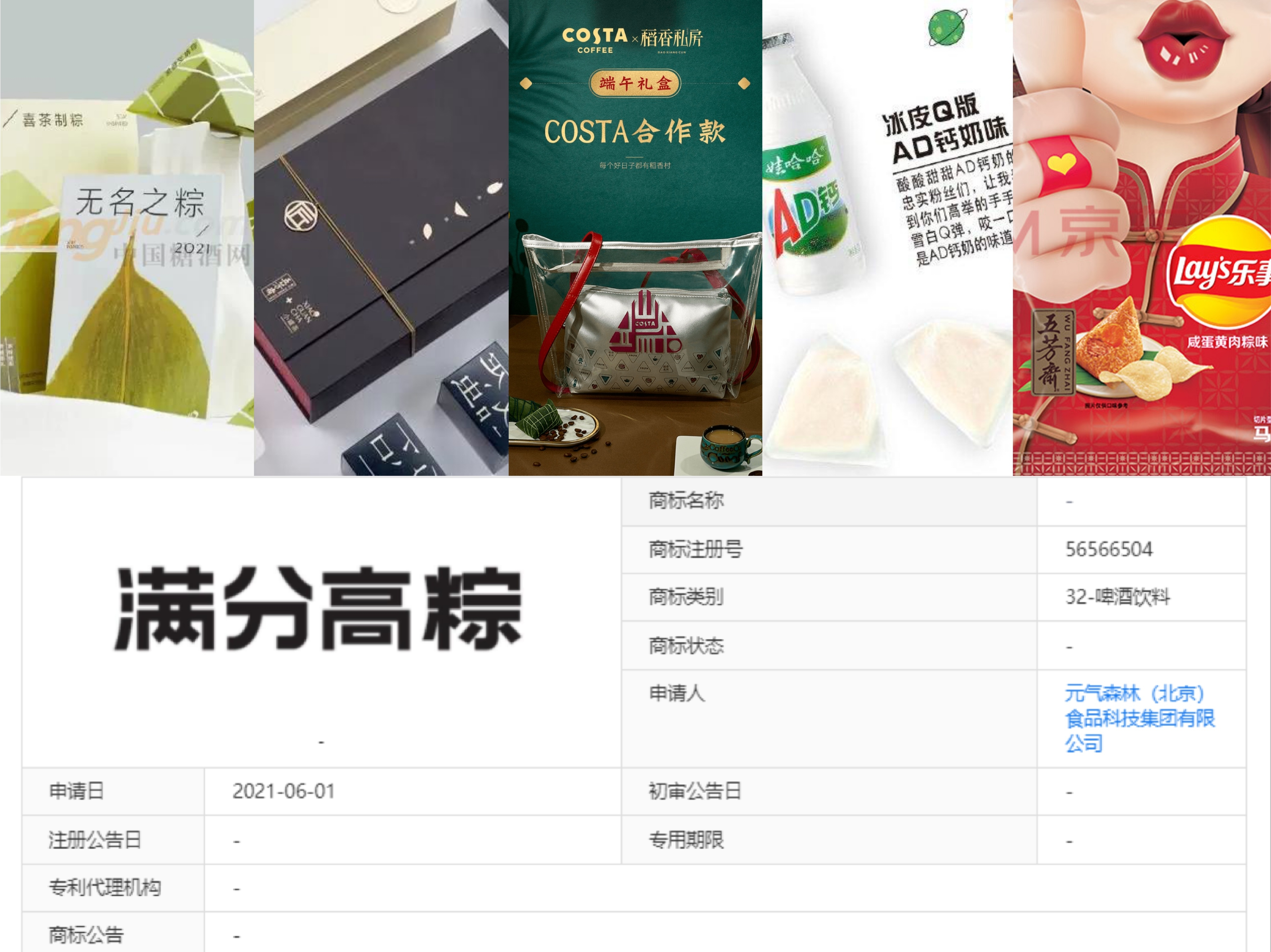 有些品牌会选择直接将粽子“要素化”后与自家产品结合,再推出新产品,如大董的烤鸭粽、娃哈哈的AD钙奶粽,以及乐事与五芳斋联合推出的咸蛋黄肉粽味薯片等;有些品牌则将目光放到了商标之上——今年6月,《商业数据派》发现元气森林正在申请商标“满分高粽”,国际分类涉及啤酒饮料。