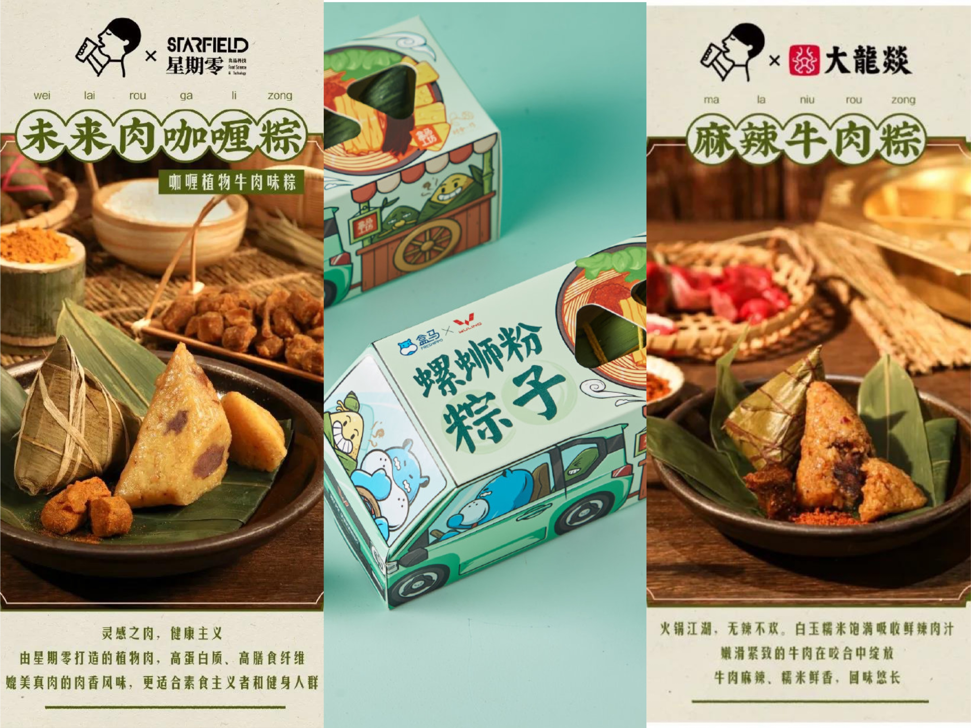 王者荣耀与五芳斋联名的粽子礼盒、新茶饮品牌“喜茶”与“大龙燚”火锅、人造肉品牌“星期零”的联名款麻辣牛肉粽、未来肉咖喱粽也凭借IP热度高、口味独特、概念新鲜等特质,引发了不少讨论。