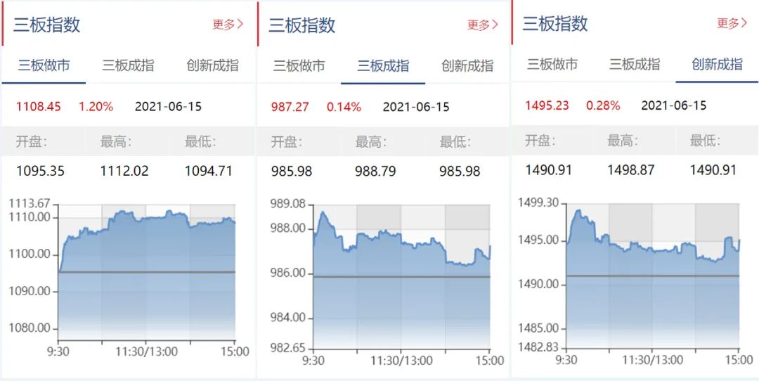 截至6月15日收盘,三板做市报1108.45点,上涨1.02%;三板成指报987.27点,上涨0.14%;三板创新报1495.23点,下上涨0.28%。