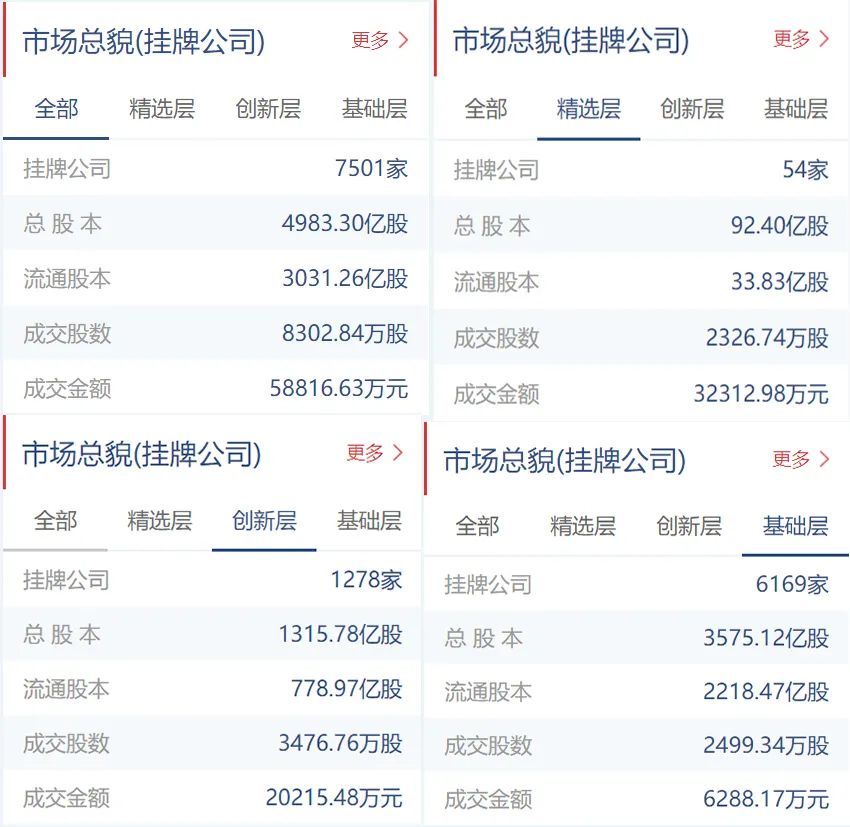 截至6月15日收盘,今日成交金额为5.88亿元,精选层成交金额为3.23亿元,创新层成交金额为2.02亿元,基础层成交金额为0.63亿元;今日成交股数为8302.84万股,精选层成交股数为2326.74万股,创新层成交股数为3476.76万股,基础层成交股数为2499.34万股。