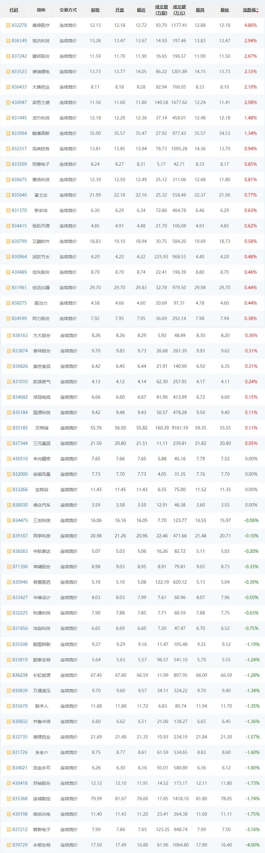 6月15日,精选层大涨,28家企业上涨,4家平盘,22家下跌。其中,鹿德医疗(832278)上市首日涨幅居首,上涨4.86%;其次,旭杰科技(836149)上涨2.94%;永顺生物(839729)跌幅居首,下跌4.00%;智新电子(837212)居次下跌3.16%;丰光精密(430510)、安徽凤凰(832000)平盘。