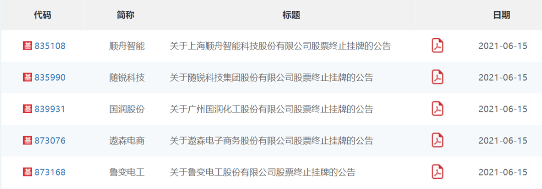 6月15日,全国股转公司消息,新三板基础层公司九尊能源(835108)、随锐科技(835990)、国润股份(839931)、遨森电商(873076)、鲁变电工(873168)终止挂牌。