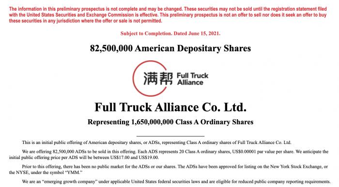 北京时间6月16日,全球领先的数字货运平台满帮集团向美国证券交易委员会(SEC)提交了更新版招股书。招股书显示,满帮计划在纽交所挂牌上市,股票代码“YMM”,锁定“数字货运第一股”。此次IPO由摩根士丹利、中金公司、高盛、瑞银、华泰证券、花旗和野村证券担任联席主承销商,华兴资本和里昂证券担任副承销商。