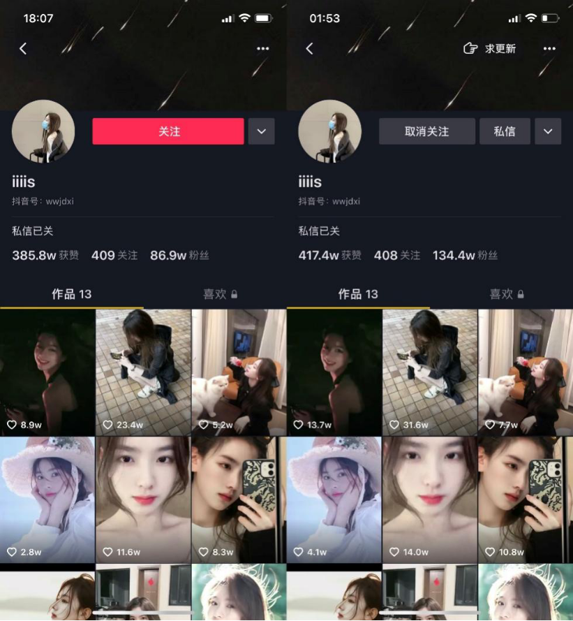 当时iiiis账号的粉丝数为85万,截止次日凌晨一点半,粉丝数为133.5万,半天净增48.5万粉丝。