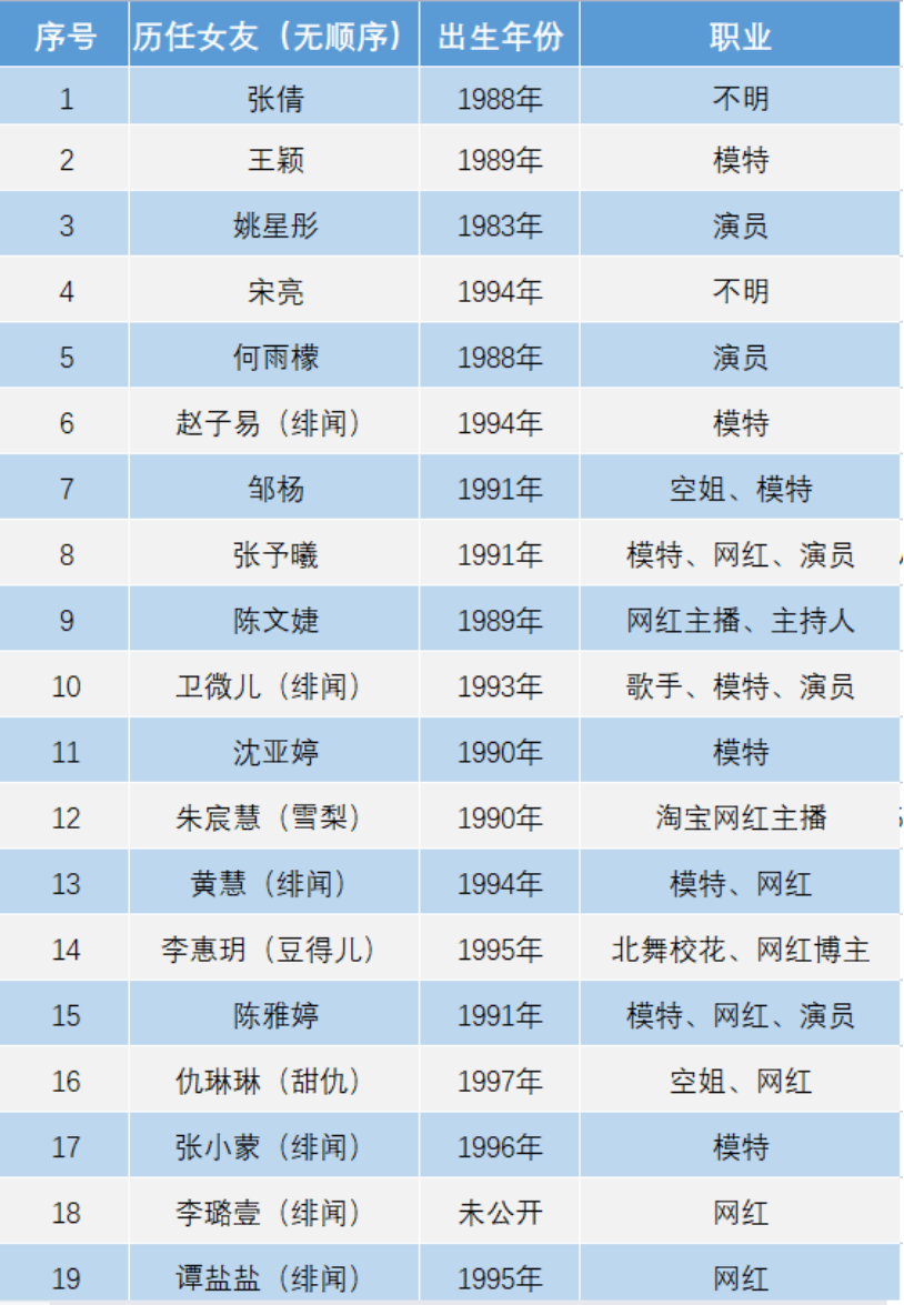 作为爆款女友的孵化器,盒饭财经据已公开资料统计发现,自2010年起,11年里,王思聪历任公开女友或绯闻女友至少在19位,包括张倩、王颖、姚星彤、宋亮、张予曦、雪梨、豆得儿、甜仇等。