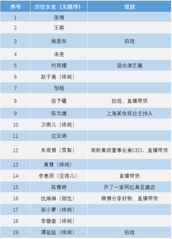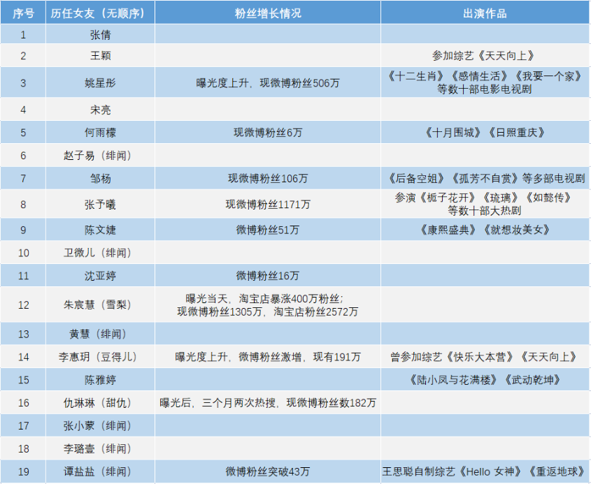 尽管可能非自己所愿,一个较明显的事实是,王校长历任女朋友,在与其交往期间及分手后,几乎都实现了个人最大曝光度。