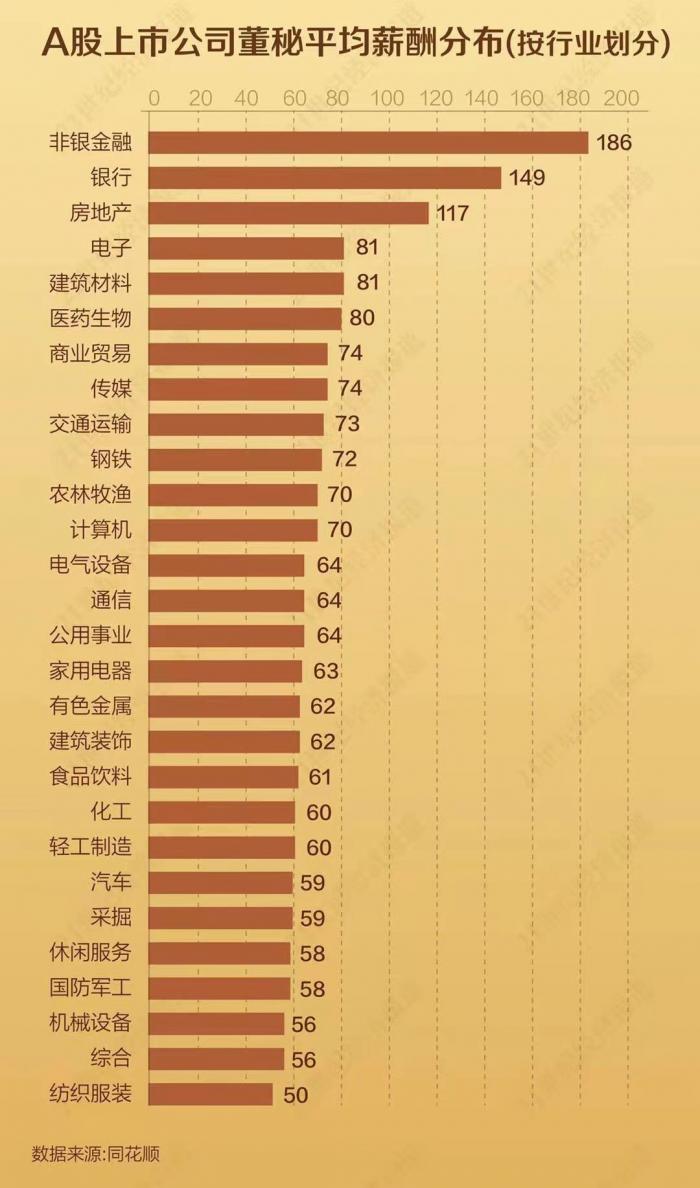 除了常年位于高薪榜前列的金融、房地产行业外,钢铁行业董秘也表现不凡。据统计,2020年钢铁行业董秘平均薪资达80万元,36位钢铁行业董秘中有5位薪资超百万。如,中信特钢(000708)董秘王海勇,去年涨薪71万元,年薪为414万元。宝钢股份(600019)董秘王娟在年薪近185万的基础上还持有近216万元市值的公司股份。但钢铁行业内,董秘们的薪酬差距也较大,多数董秘薪酬不足50万元。