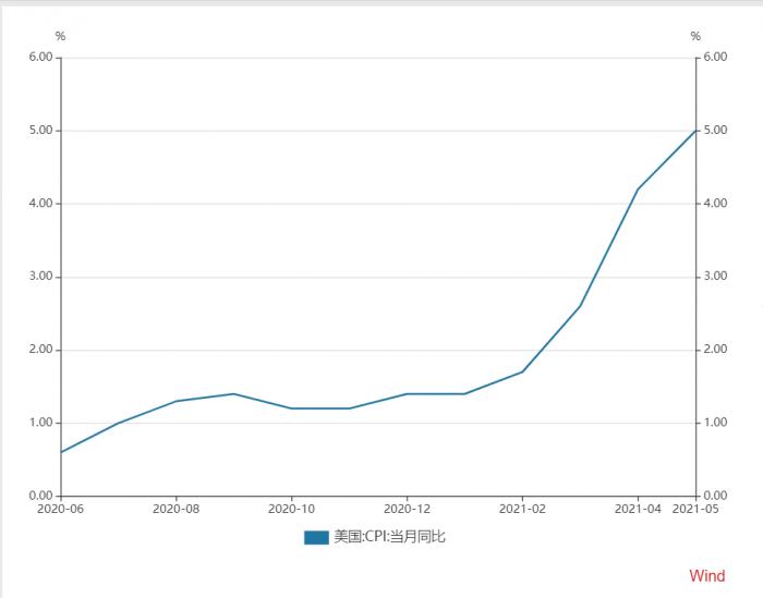 近日,美国劳工部公布,2021年5月消费者物价指数(CPI)较2020年同期上涨5%,创下2008年8月以来的最高涨幅。剔除食品和能源后,CPI 依然上涨 3.8%,创下自 1992 年 5 月以来的最快速度。