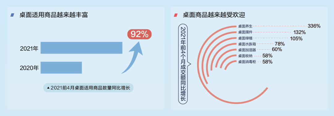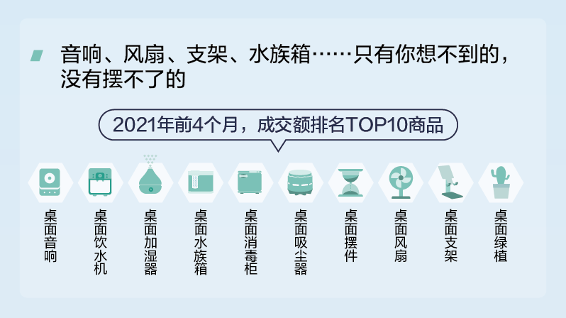近2年,进行场景创新引导新品研发的品牌越来越多。2021年前4月,销售桌面适用商品的品牌数量同比增长了25%。2021年前4月,桌面适用的商品数量同比增长了92%。桌面养生类商品成交额增长336%,桌面摆件、桌面绿植品类的成交额增长超过1倍。桌面音响、桌面饮水机、桌面加湿器是2021年以来成交额最好的桌面适用商品。
