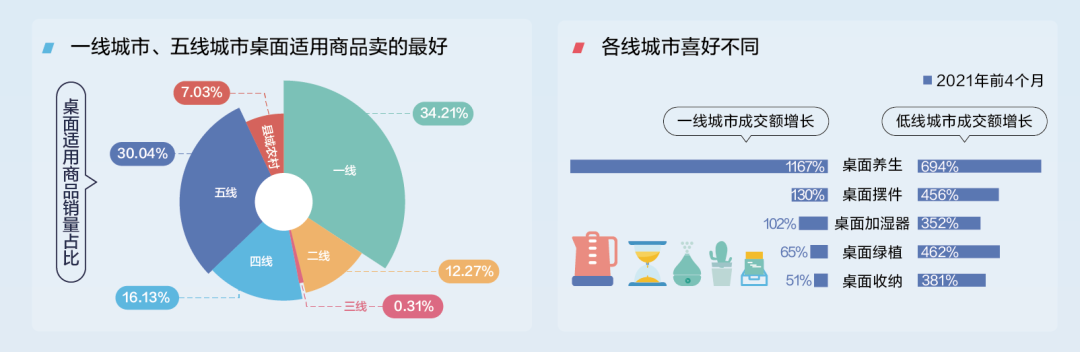与消费者特征有关,桌面经济的最大市场在一线城市,桌面适用商品销量占比34%。一线城市对桌面经济的需求中,养生、生活趣味的增长最高。2021年前4月,桌面养生类商品成交额同比增长超过10倍,桌面水族箱、桌面摆件、桌面加湿器成交额同比增长超过1倍。二线城市桌面养生、摆件类商品增长超过1倍。乡村地区桌面适用商品成交额增长111%,桌面绿植、桌面摆件成交额同比增长超过4倍。