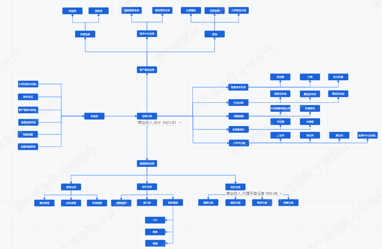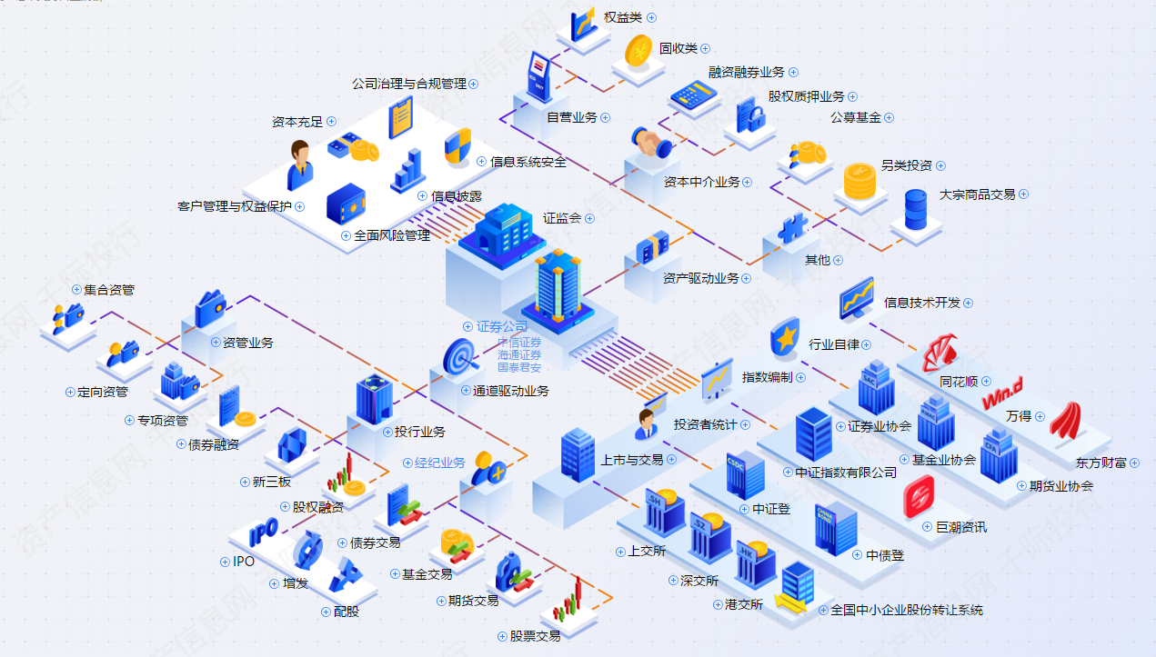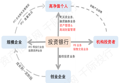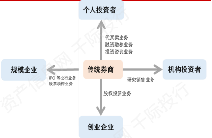 投行业务:证券公司的投资银行业务主要包括股权融资业务、债券融资及资产证券化业务、财务顾问业务、新三板业务等。投资银行业务是证券公司承担金融中介职能的直接方式,作为企业直接融资的主要渠道,发挥着优化社会资源配置的作用,属于证券公司的传统业务和主要利润来源之一。投行业务链条延伸:从保荐到创投、再融资、财富管理。