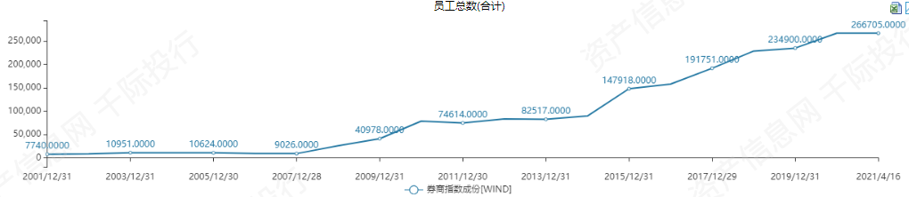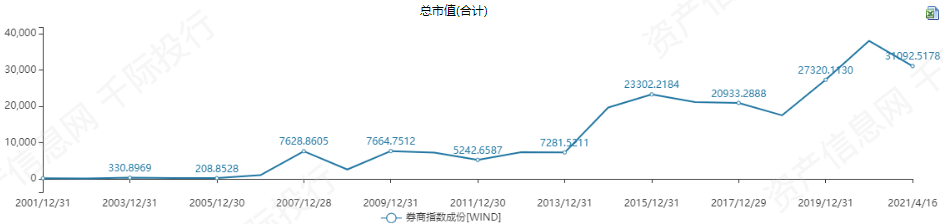 截至2019年12月31日全国共有133家证券公司,营业网点11703家,注册从业人员33.87万,证券咨询公司84家,证券市场资信评级业务11家。2019年度实现营业收入3604.83亿元,净利润1230.95亿元,其中,120家公司实现盈利,13家亏损。133家证券公司总资产为7.26万亿元,净资产为2.02万亿元,净资本为1.62万亿元,客户交易结算资金余额1.30万亿元,受托管理资金本金总额12.29万亿元。从具体的各项业务来看,2019年代理买卖证券业务净收入(含席位租赁)实现787.63亿元、证券承销与保荐业务净收入377.44亿元、财务顾问业务净收入105.21亿元、投资咨询业务净收入37.84亿元、资产管理业务净收入275.16亿元、证券投资收益(含公允价值变动)1,221.60亿元。截至2020年末期末A股投资者数为17777.49万。截至2020年底,A股上市公司4140家,沪深两市市值超过80万亿,其中2039家来自主板,约占上市公司总量的一半;中小板、创业板、科创板分别有上市公司994家、892家、215家,占上市公司总量的比例分别为24.01%、21.55%、5.19%。从公司属性来看,4140家上市公司中,民营企业占绝大多数,共有2522家,占比61.36%;央企、地方国企、外资企业分别有398家、766家、151家,合计占比31.76%。