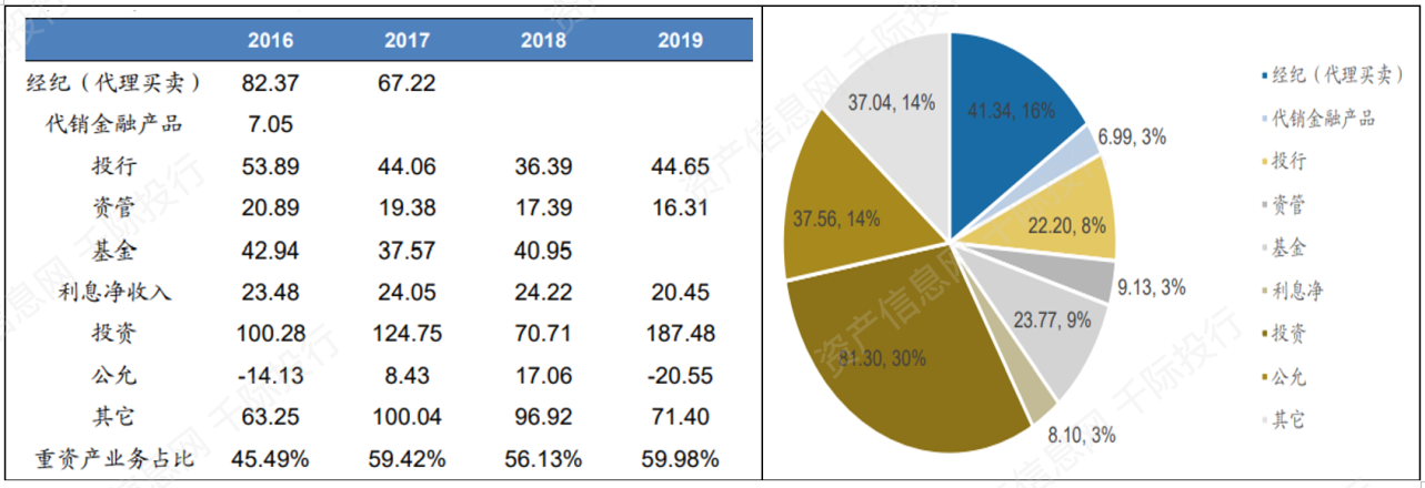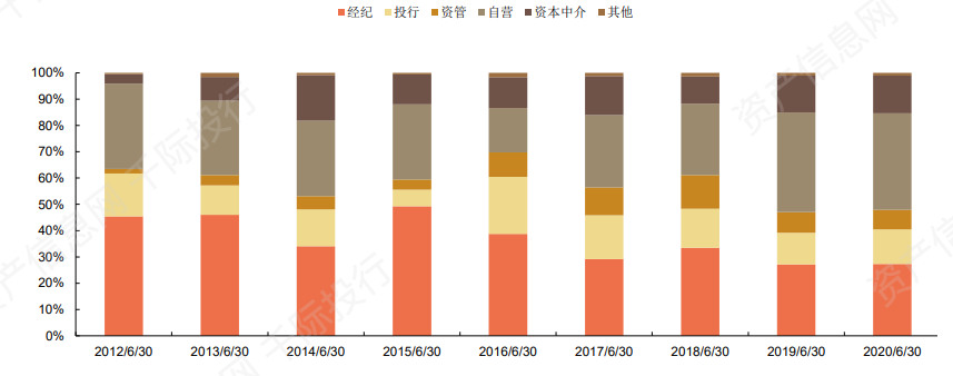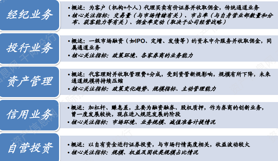 证券公司的核心业务可以分为经纪业务、投行业务、资管业务、投资业务和资本中介业务。其中,经纪业务、投行业务和资管业务属于证券公司传统业务,这类业务是基于证券公司的牌照优势形成的通道或受托业务。由于证券公司不需要过多的资金投入,因此被称为“轻资产”业务。投资业务和资本中介属于创新业务,相对应“轻资产”业务,投资业务和资本中介业务称为“重资产业务”。