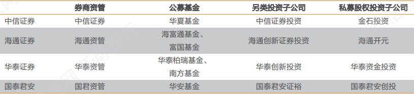 资管业务:证券公司的投资管理业务主要包括券商资产管理业务、公募基金管理业务、私募股权投资 基金、另类投资等。中信证券、海通证券、华泰证券、国泰君安的业务布局如下。