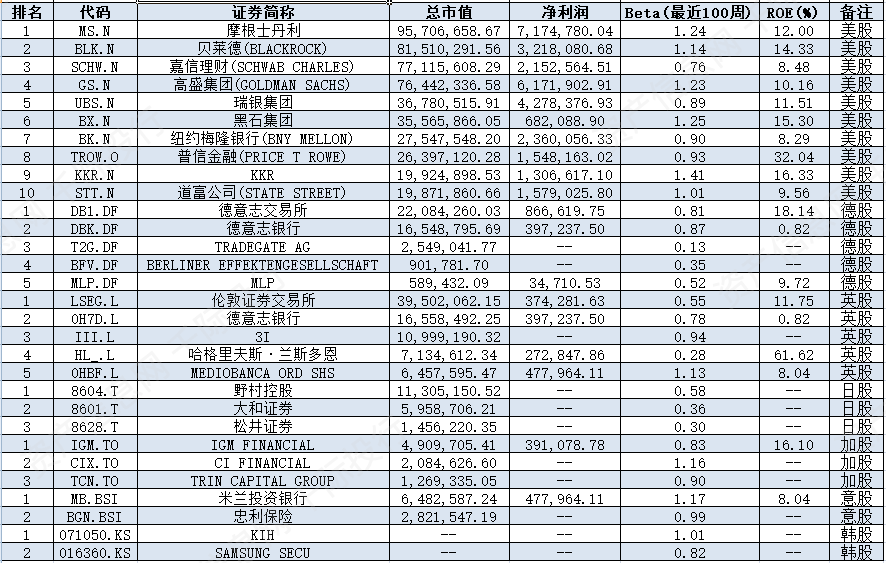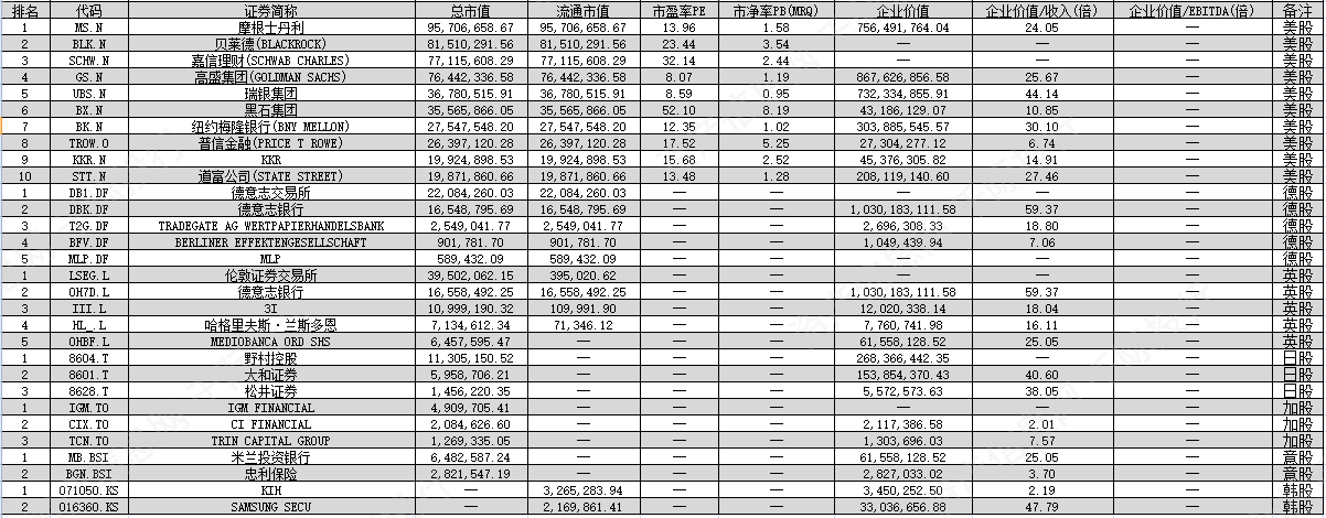 全球非中国主要企业有摩根士丹利[MS.N]、贝莱德(BLACKROCK)[BLK.N]、嘉信理财(SCHWAB CHARLES)[SCHW.N]、黑石集团[BX.N]、纽约梅隆银行(BNY MELLON)[BK.N]、普信金融(PRICE T ROWE)[TROW.O]、KKR[KKR.N]、道富公司(STATE STREET)[STT.N]、德意志交易所[DB1.DF]、德意志银行[DBK.DF]、TRADEGATE AG WERTPAPIERHANDELSBANK[T2G.DF]、BERLINER EFFEKTENGESELLSCHAFT[BFV.DF]、MLP[MLP.DF]、伦敦证券交易所[LSEG.L]、德意志银行[0H7D.L]、3I[III.L]、哈格里夫斯·兰斯多恩[HL_.L]、MEDIOBANCA ORD SHS[0HBF.L]、野村控股[8604.T]、大和证券[8601.T]、松井证券[8628.T]、IGM FINANCIAL[IGM.TO]、CI FINANCIAL[CIX.TO]、TRIN CAPITAL GROUP[TCN.TO]、米兰投资银行[MB.BSI]、忠利保险[BGN.BSI]、KIH[071050.KS]等。