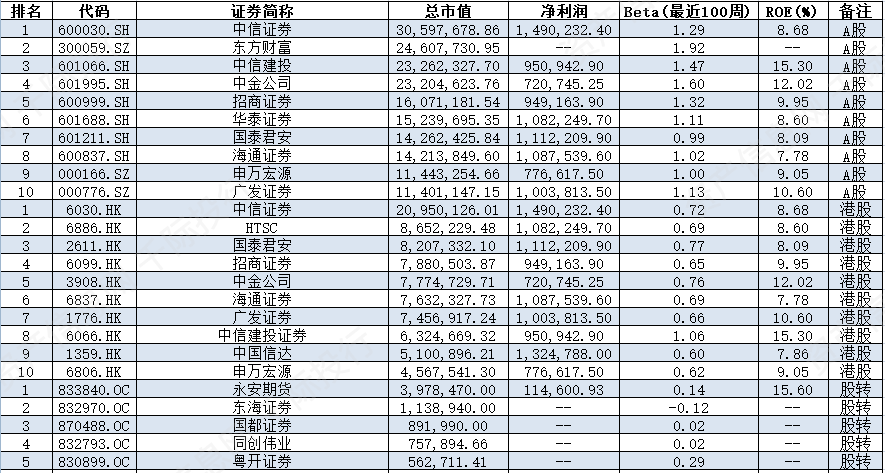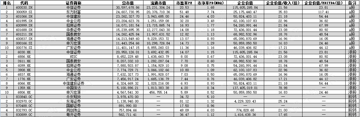中国主要企业有中信证券[600030.SH]、东方财富[300059.SZ]、中信建投[601066.SH]、中金公司[601995.SH]、招商证券[600999.SH]、华泰证券[601688.SH]、国泰君安[601211.SH]、海通证券[600837.SH]、申万宏源[000166.SZ]、广发证券[000776.SZ]、中信证券[6030.HK]、HTSC[6886.HK]、国泰君安[2611.HK]、招商证券[6099.HK]、中金公司[3908.HK]、海通证券[6837.HK]、广发证券[1776.HK]、中信建投证券[6066.HK]、中国信达[1359.HK]、申万宏源[6806.HK]、国都证券[870488.OC]、同创伟业[832793.OC]、粤开证券[830899.OC]等。
