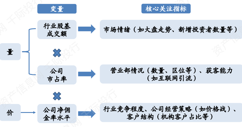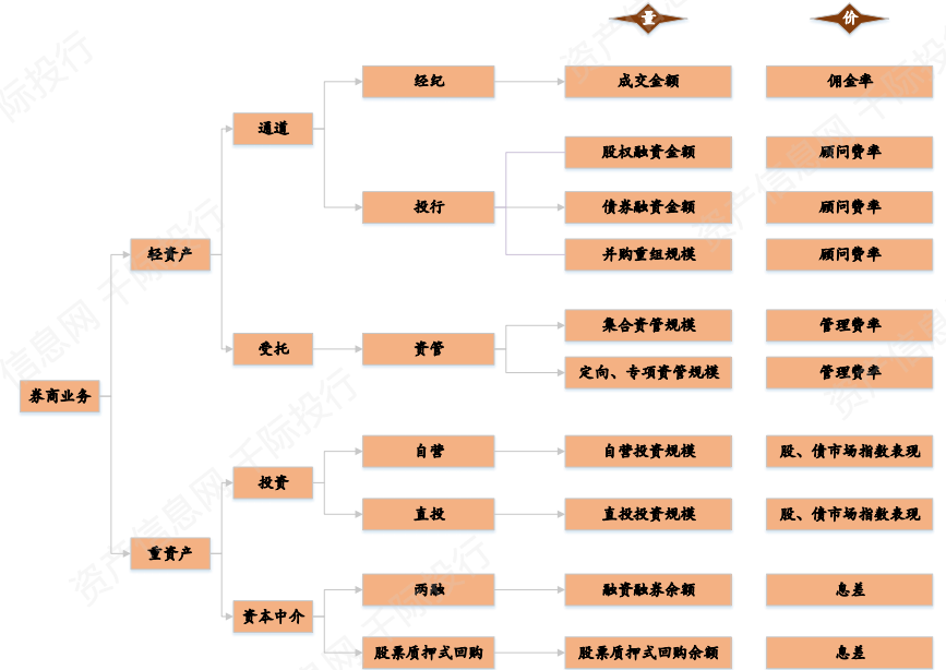 轻重资产业务驱动因素完全不同。轻资产业务主要驱动因素为业务规模,由于不需要过多资本投入,因此业务弹性很大。同时,该业务存在一定的同质性,管理费率由于竞争加剧呈现不断下降趋势。重资产业务更多地体现证券公司的主动管理能力和现有资源能力,往往能力强的券商业务规模也相对较大,实现规模和费率双优势。为了清楚展现券商的业务构成以及相应的驱动因素,我们采用“价” “量”分析的方法进行汇总。