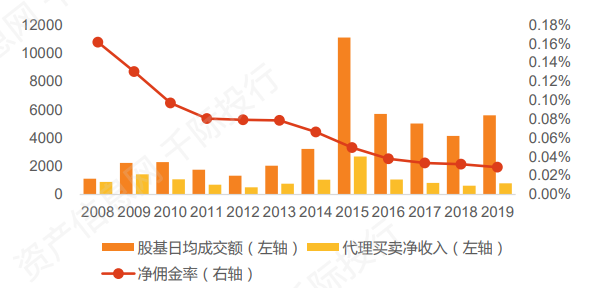 图 经纪业务的净佣金率的降势趋缓,但交易量已趋势向上(单位:亿元)