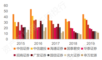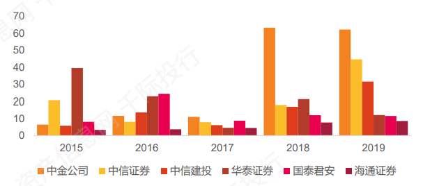 图 2015-2019年头部券商IPO项目规模对比(单位:亿元)