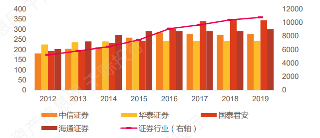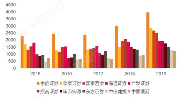 图 2015-2019年交易业务规模前十券商对比(亿元)