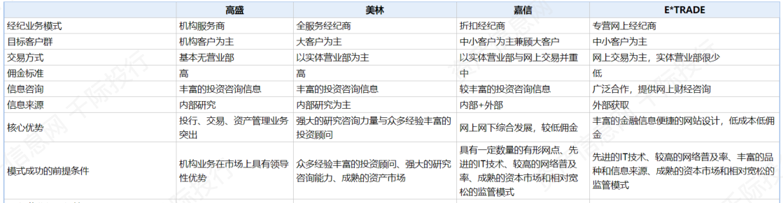 参考美国证券行业的竞争格局和发展模式,美国的各家证券公司之间的业务结构差别很大,买方业务和卖方业务、个人业务和机构业务,各家公司的重点有一定的差异,总体而言,标志性的有高盛模式、美林模式、嘉信理财模式和E-trade四种模式。其中,高盛以机构客户业务为主,美林、嘉信和E-trade均有零售客户业务,但针对的客户群和业务模式不尽相同。