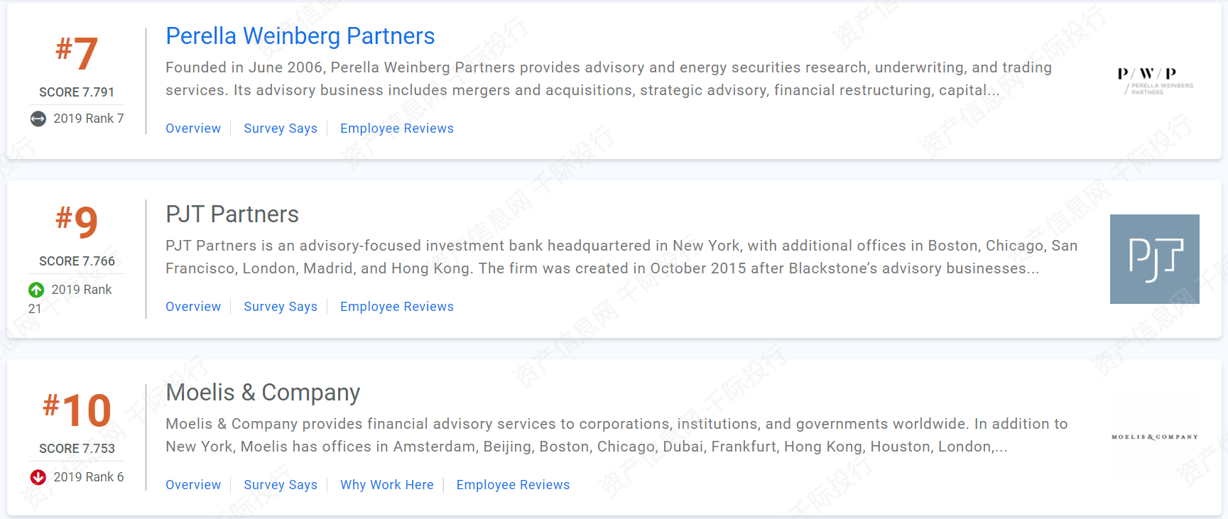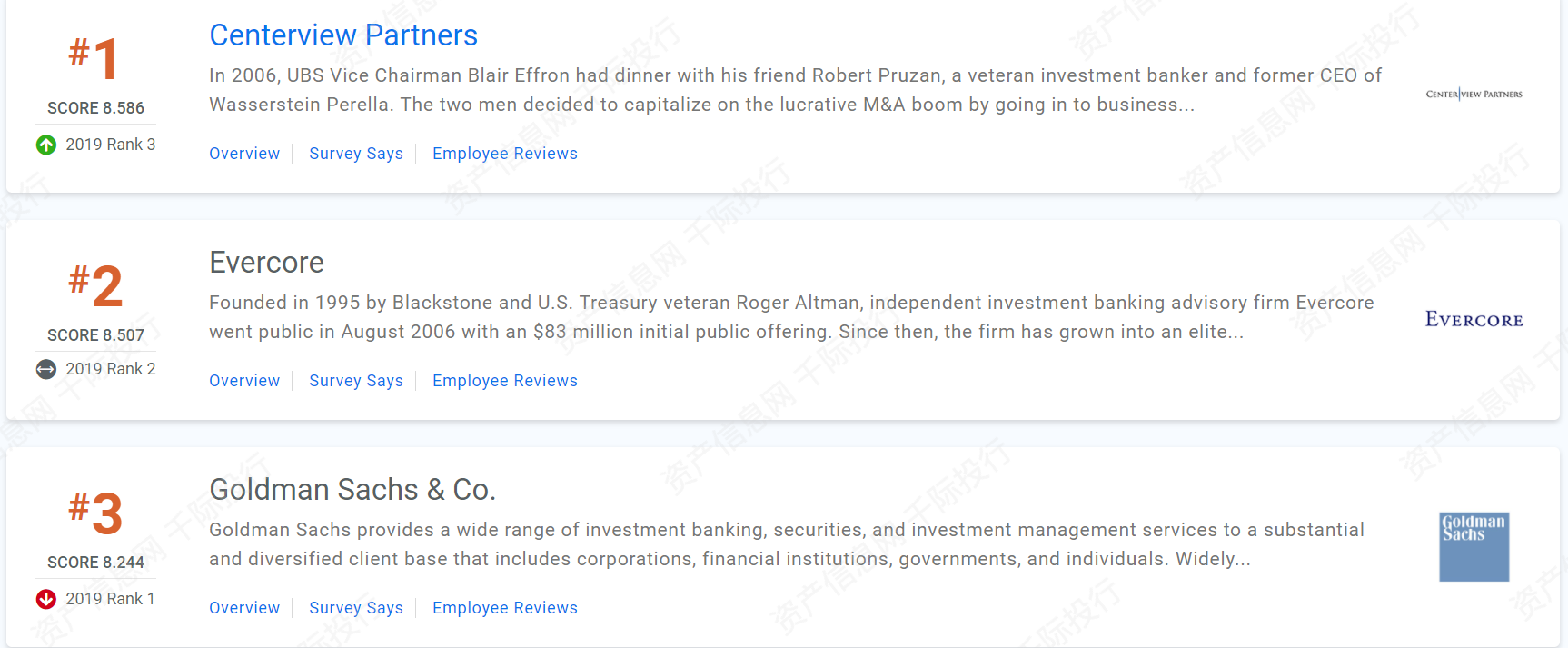 Vault发布的2020年银行50排名。他的排名来自vault的年度银行调查。这项调查于2019年秋季进行,要求3,300名各级银行专业人员根据声望评估其同行公司,规模为1至10(他们无法对自己的公司进行评价,并要求只对所熟悉的公司进行评价)。他们还被要求对自己的公司进行各种生活质量类别的评级,包括薪酬、工时、公司文化、商业前景、培训、工作/生活平衡和总体工作满意度。将一个加权公式(包括外部声望分数和内部生活质量分数)应用于此数据,以创建银行TOP50。一些非传统知名投资银行位列前茅。