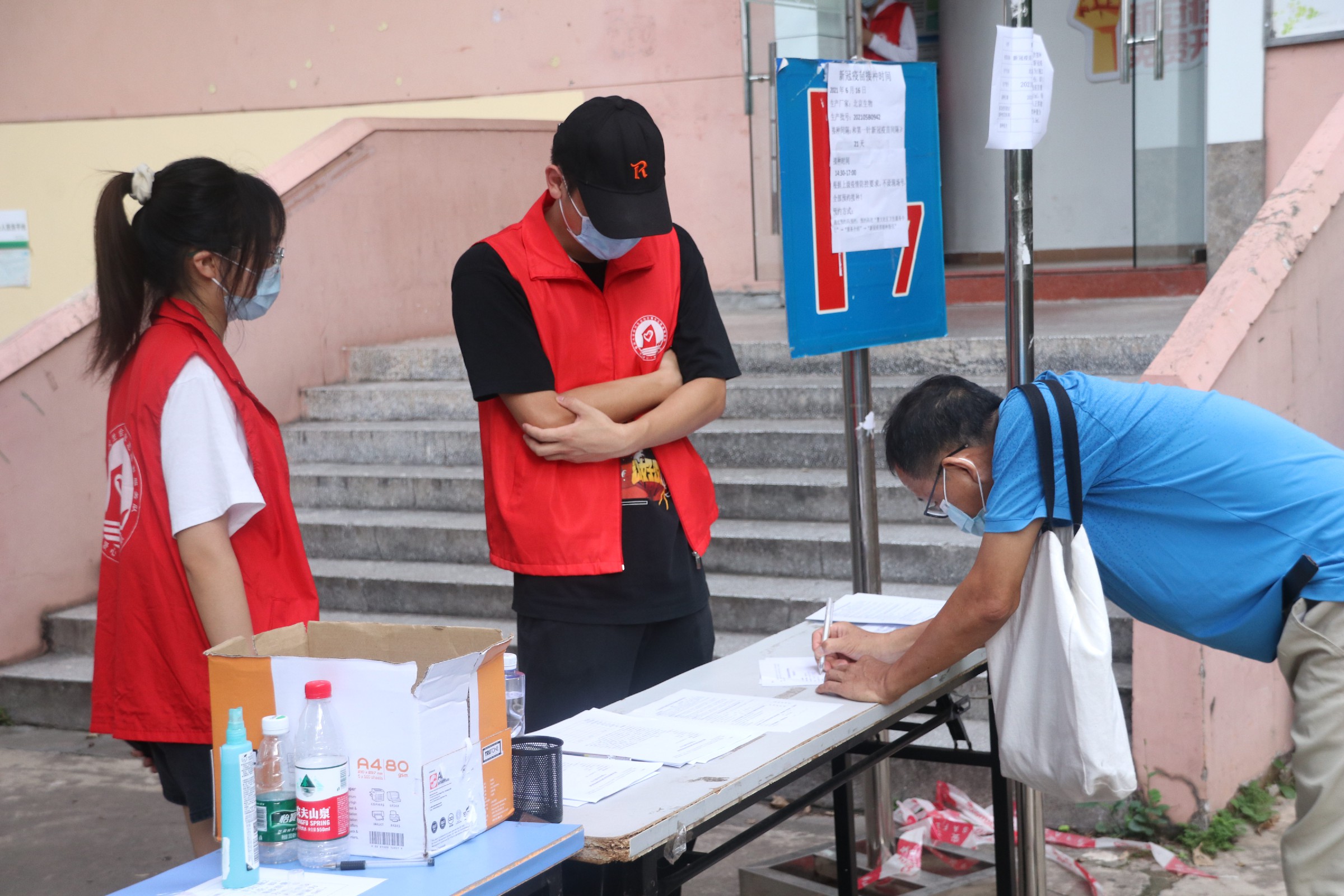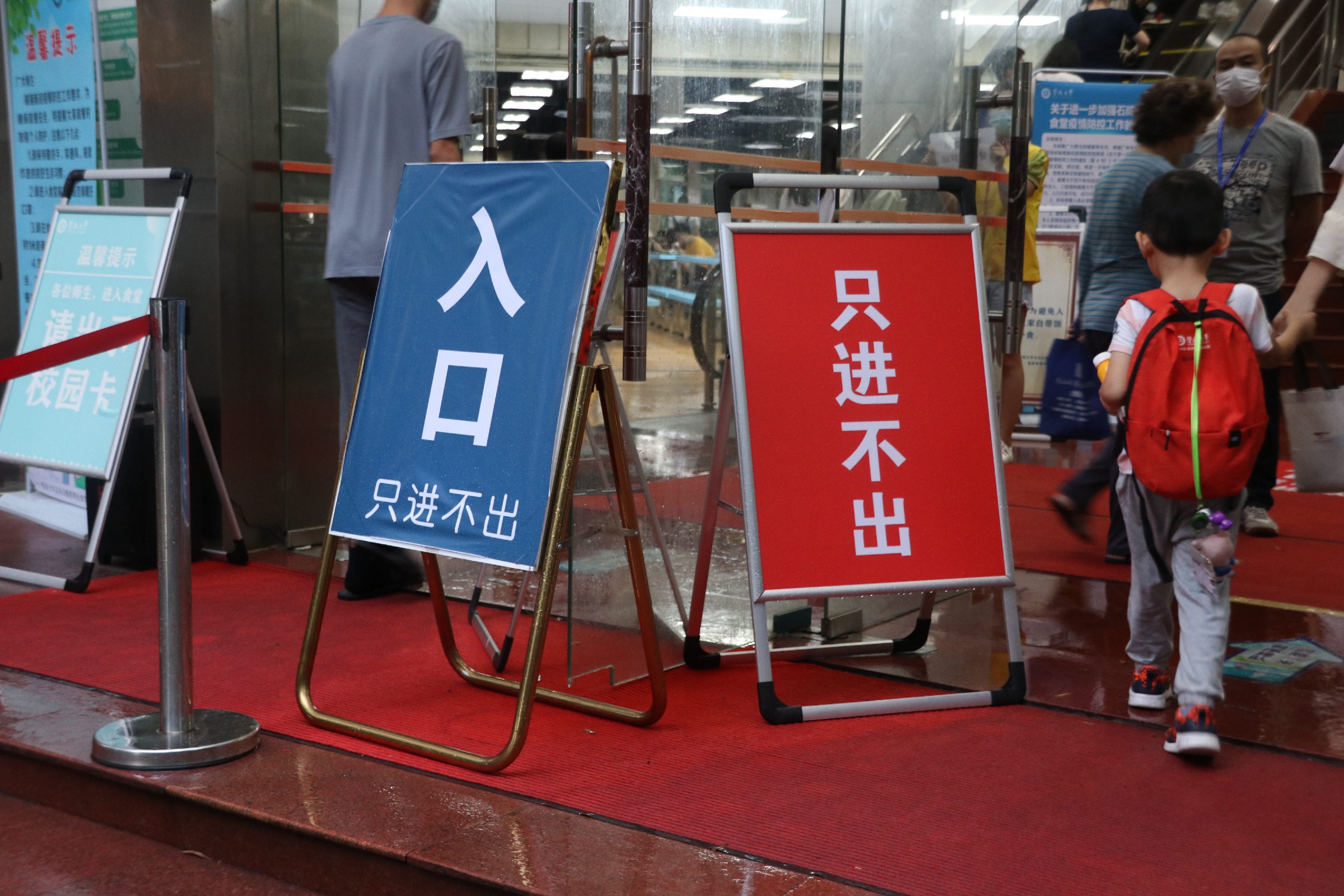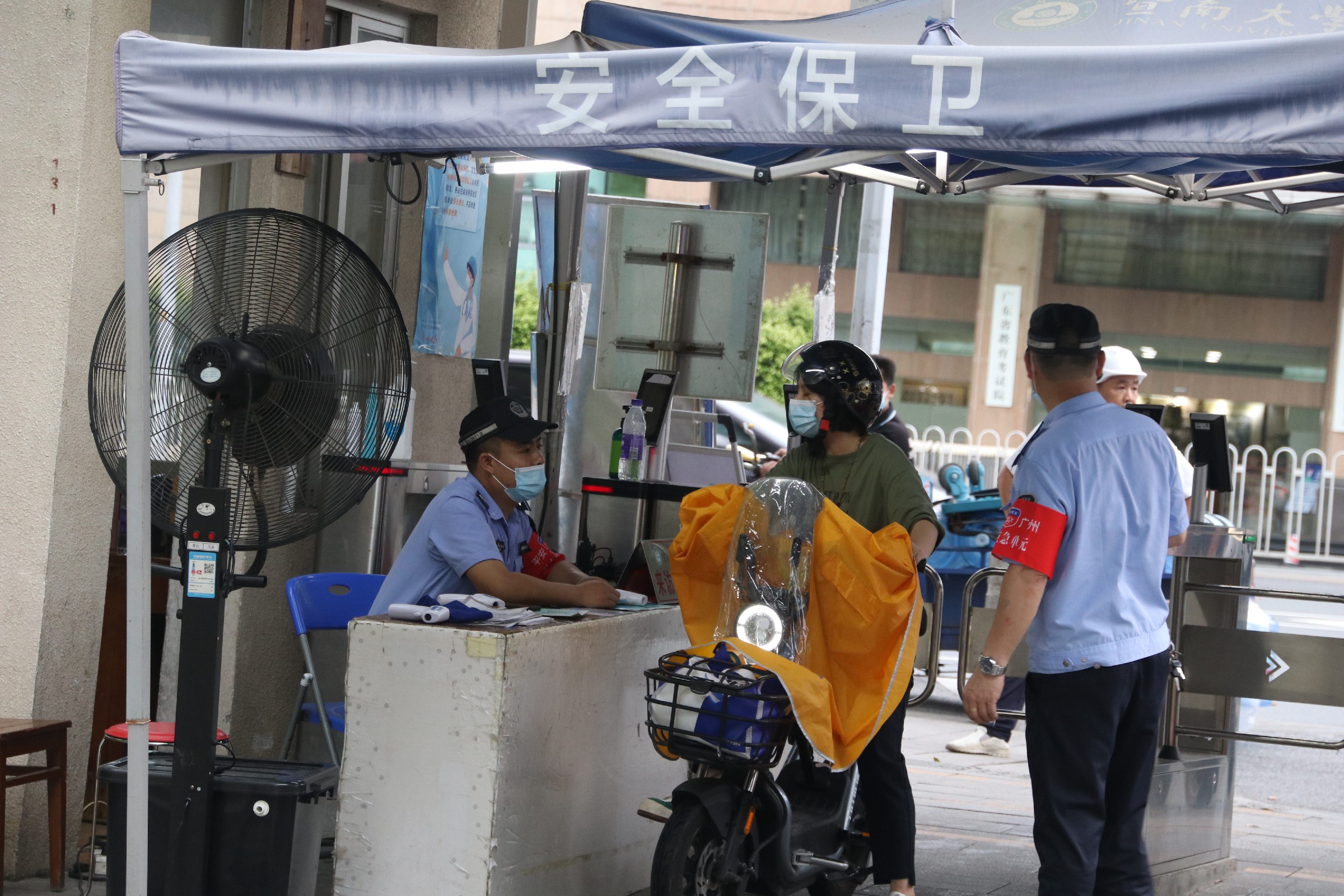 志愿者们手拿防疫标语,细心检查着每位出入的同学是否有佩戴口罩。