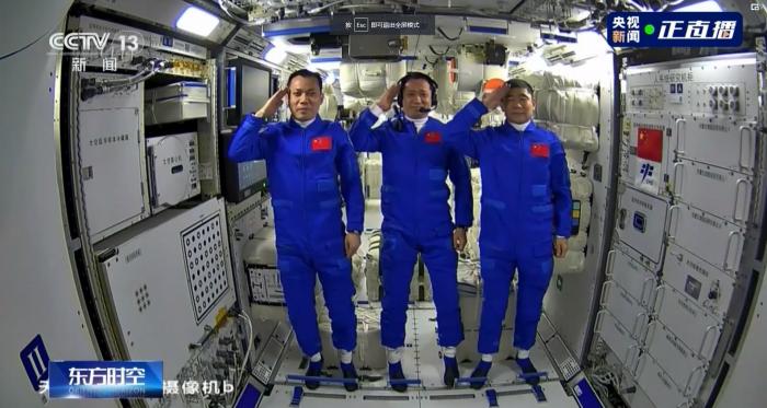 “我们乘组已进入我们的太空家园——天和核心舱,感谢全国人民的支持,感谢广大科技工作者的辛勤付出。敬礼!”进入空间站后,三名航天员向全国人民报告并致谢敬礼。