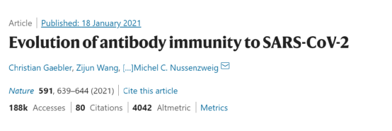 Michel Nussenzweig及同事发现在感染后6-12个月期间,分泌产生的抗体浓度并没有改变。在对康复者血液中SARS-CoV-2 特异性记忆 B 细胞分析表明急性免疫反应会持续性产生,并超过了6个月。这些记忆B细胞能不断增强其 SARS-CoV-2 特异性抗体的反应性。